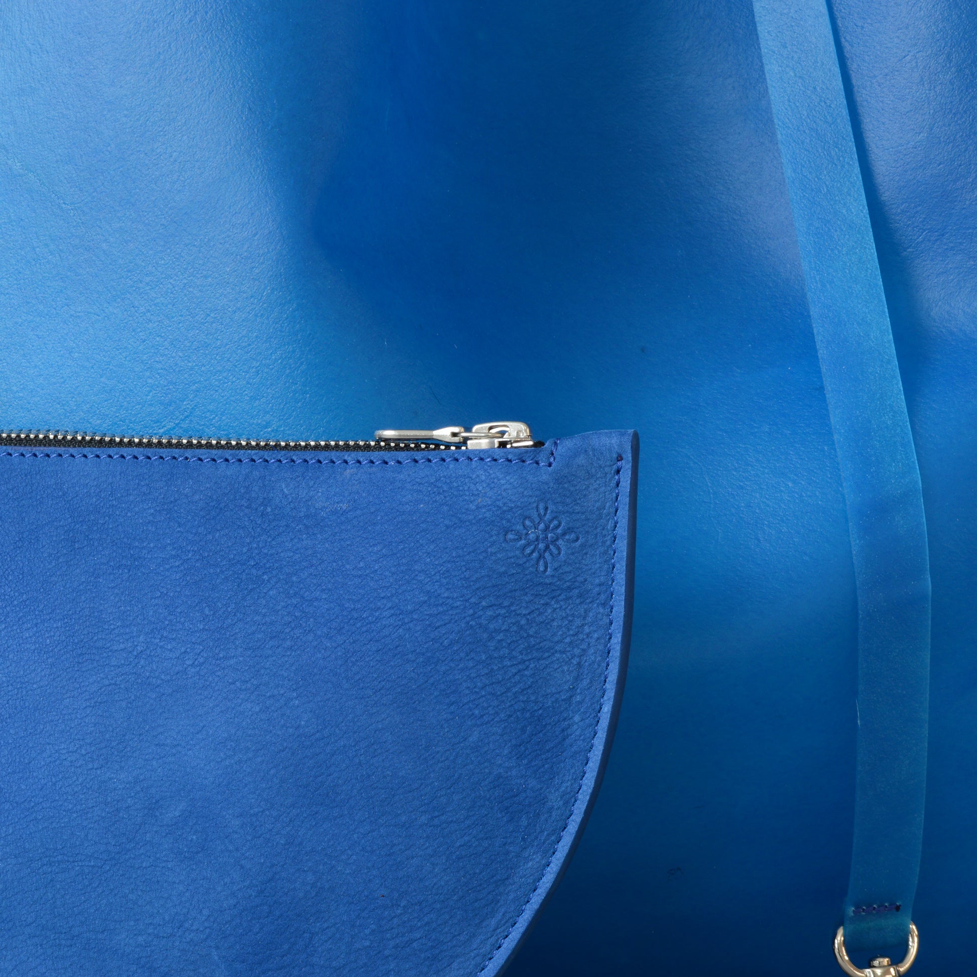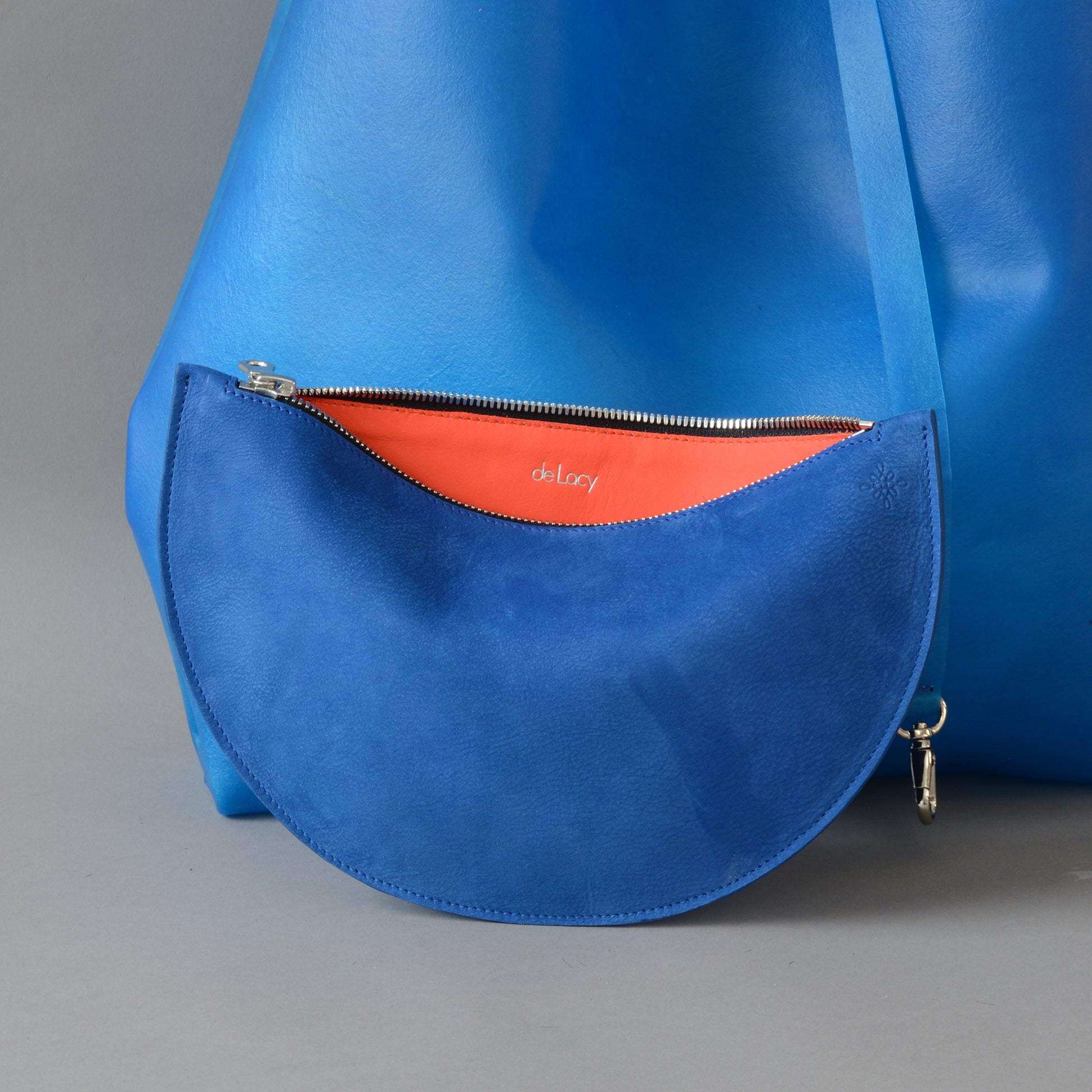 - Detachable blue nubuck leather half moon clutch bag with silver Ykk Excella zip closure & lined in bright orange nappa leather.