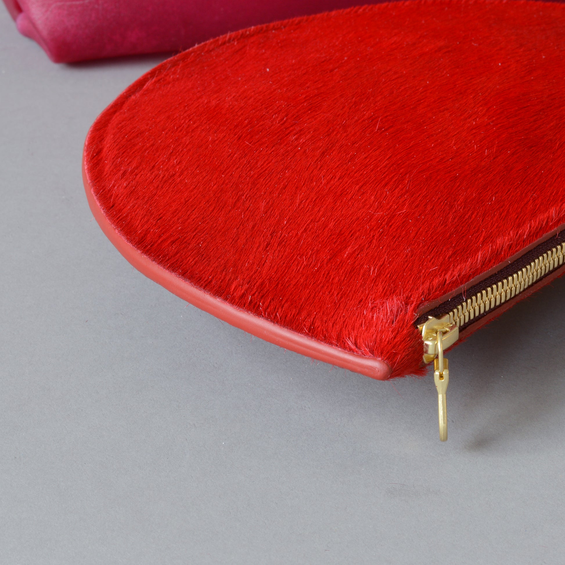 - Detachable red hair-on leather half moon clutch bag with gold Ykk Excella zip closure & lined in bright pink nappa leather.