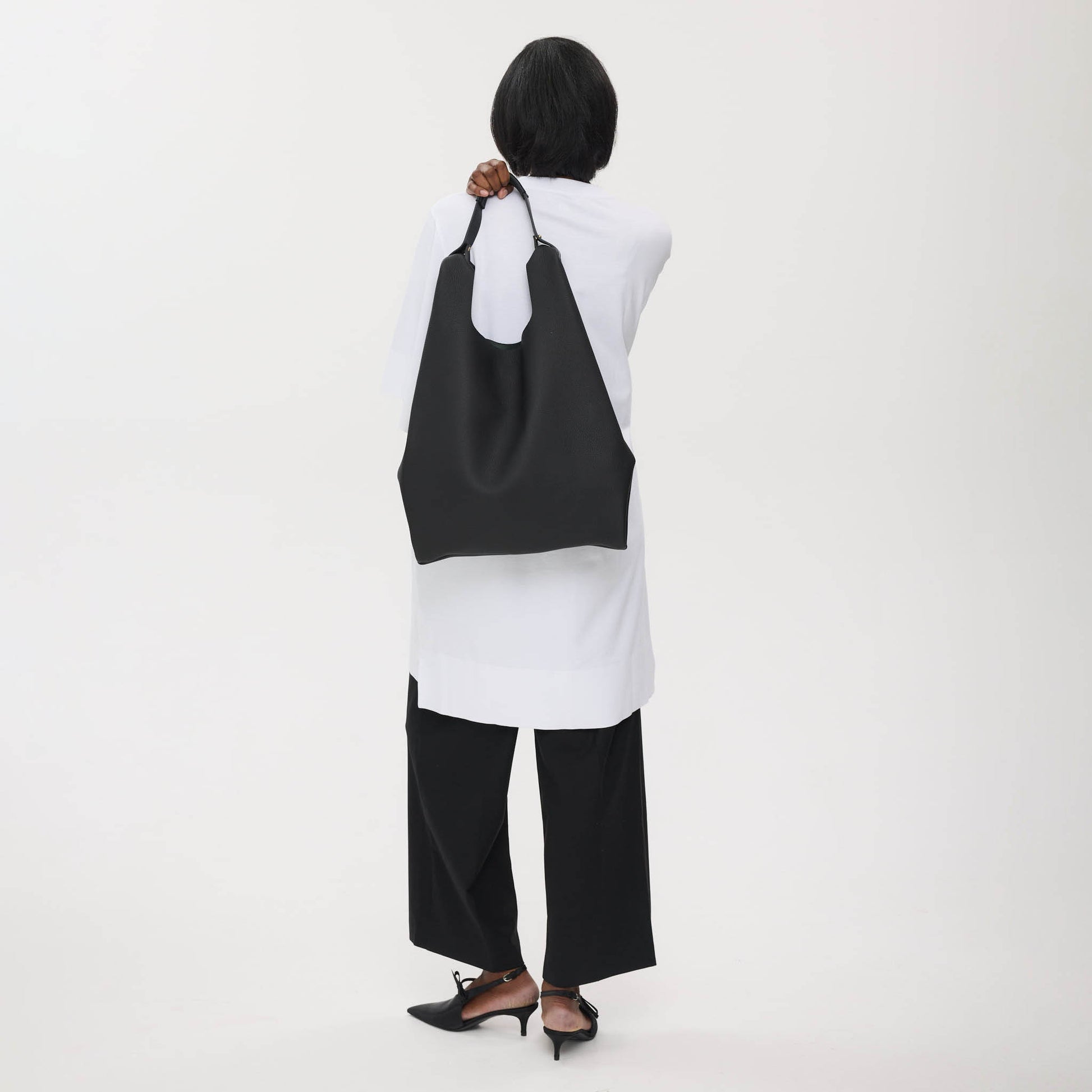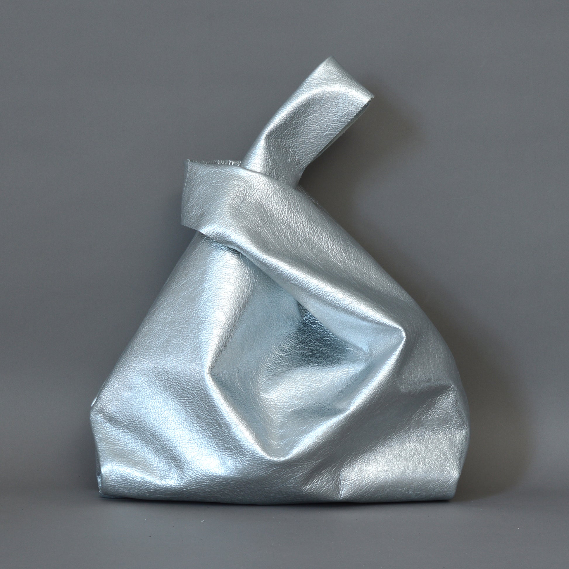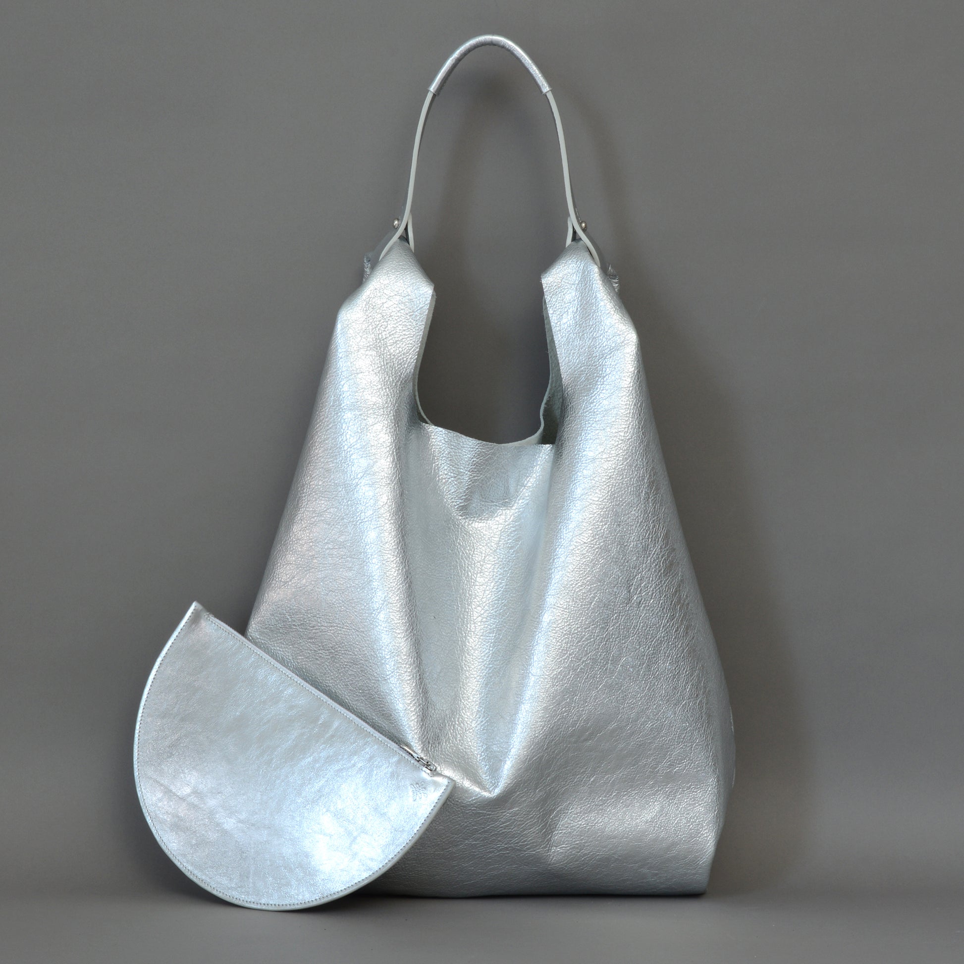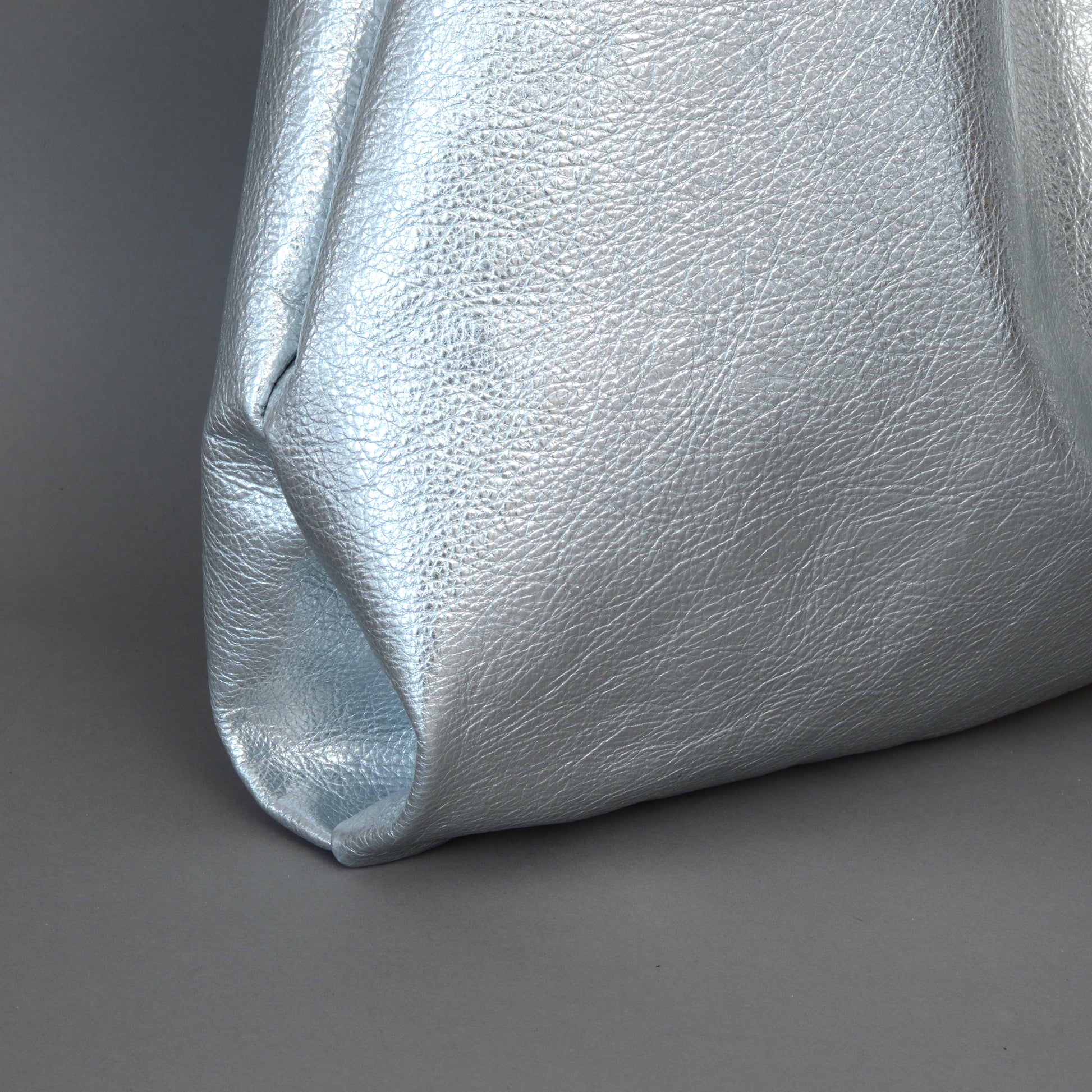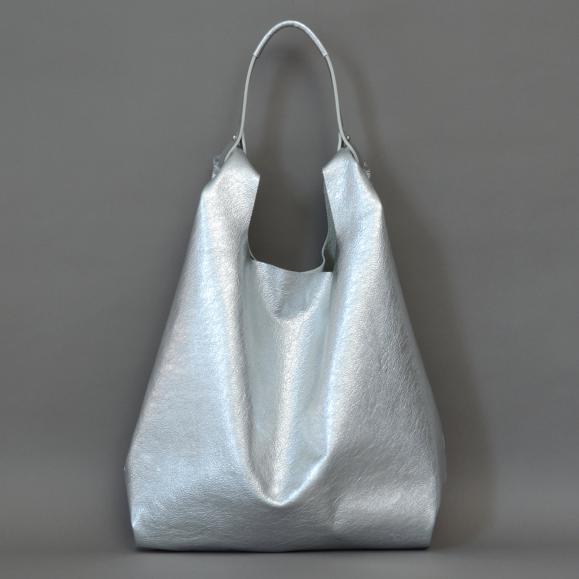 - Features metallic silver natural grain soft slouchy leather from Italy.