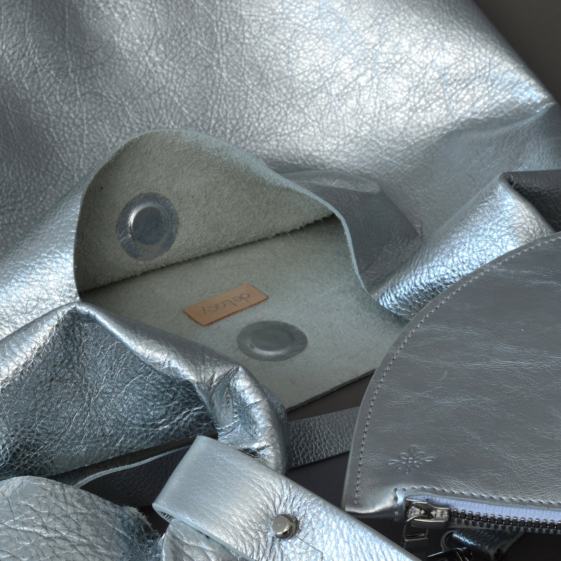 - de Lacy logo de-bossed top corner and silver foiled on leather tab inside.