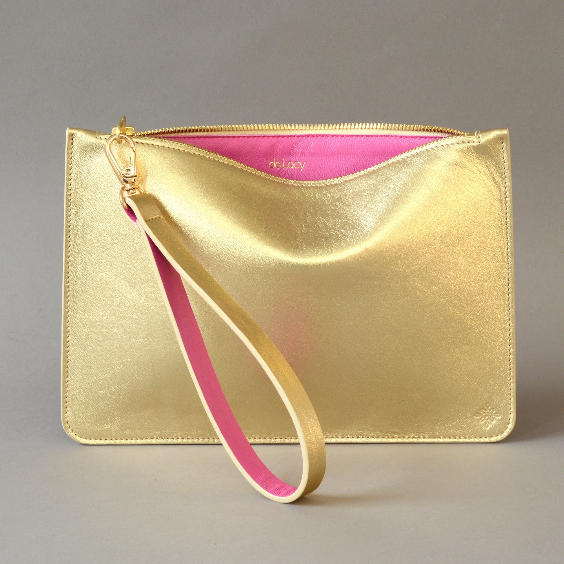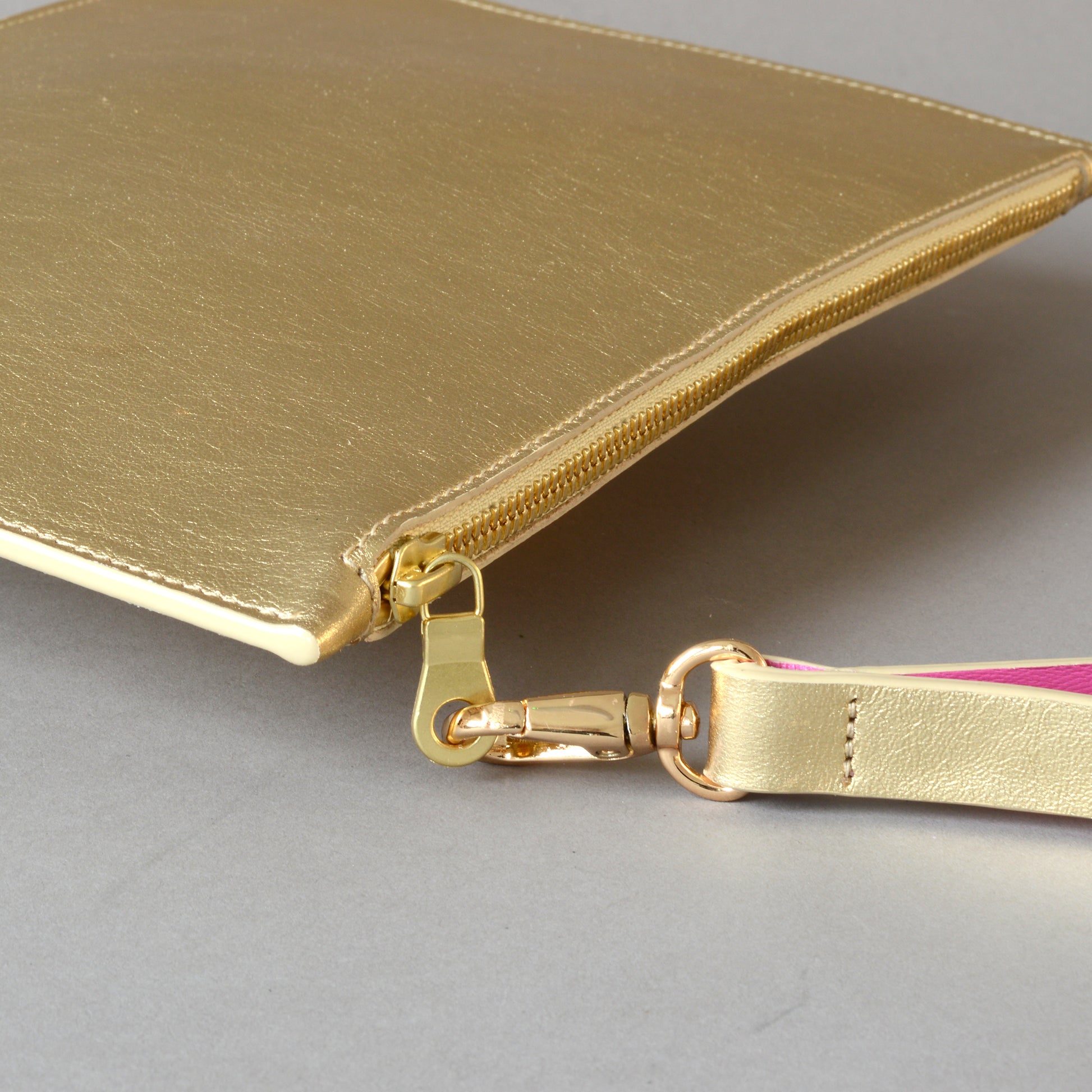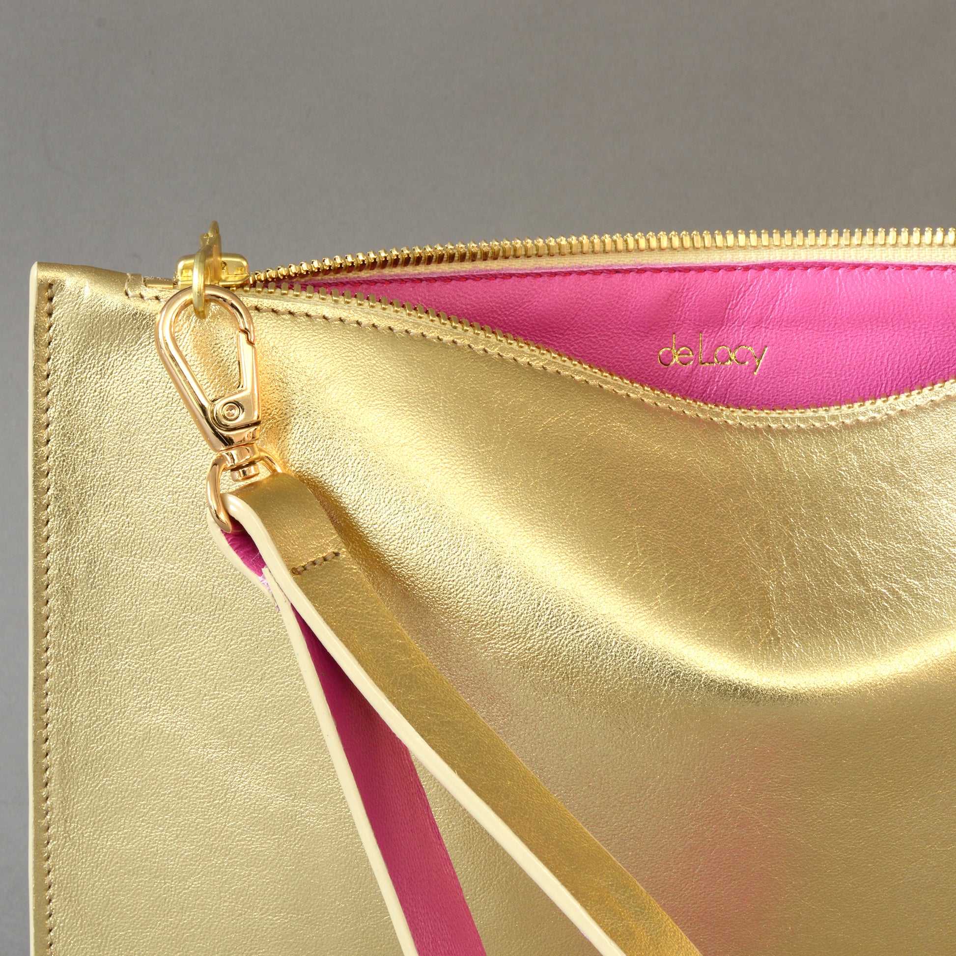 - Detachable gold leather wrist strap lined in pink leather which doubles as the zip puller.