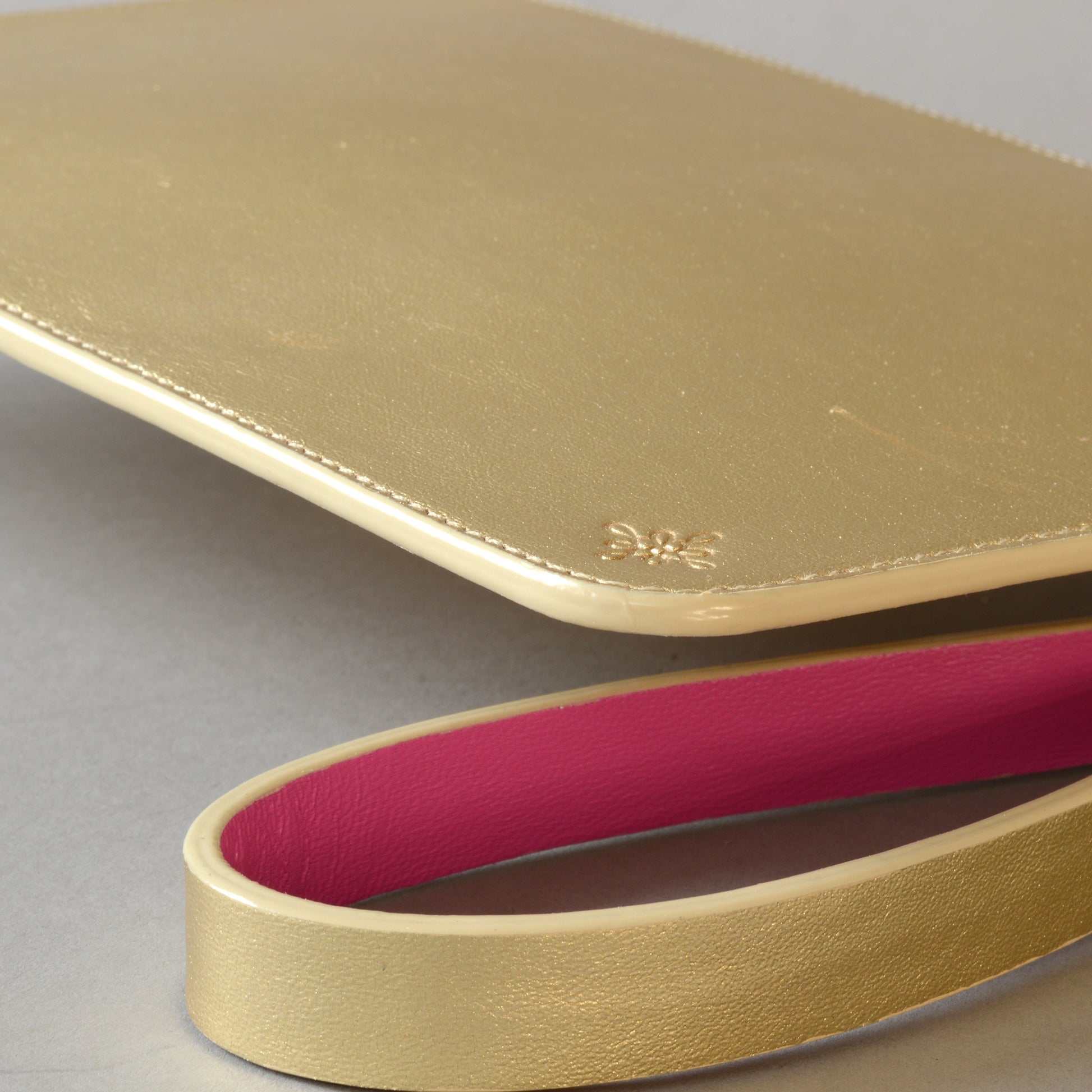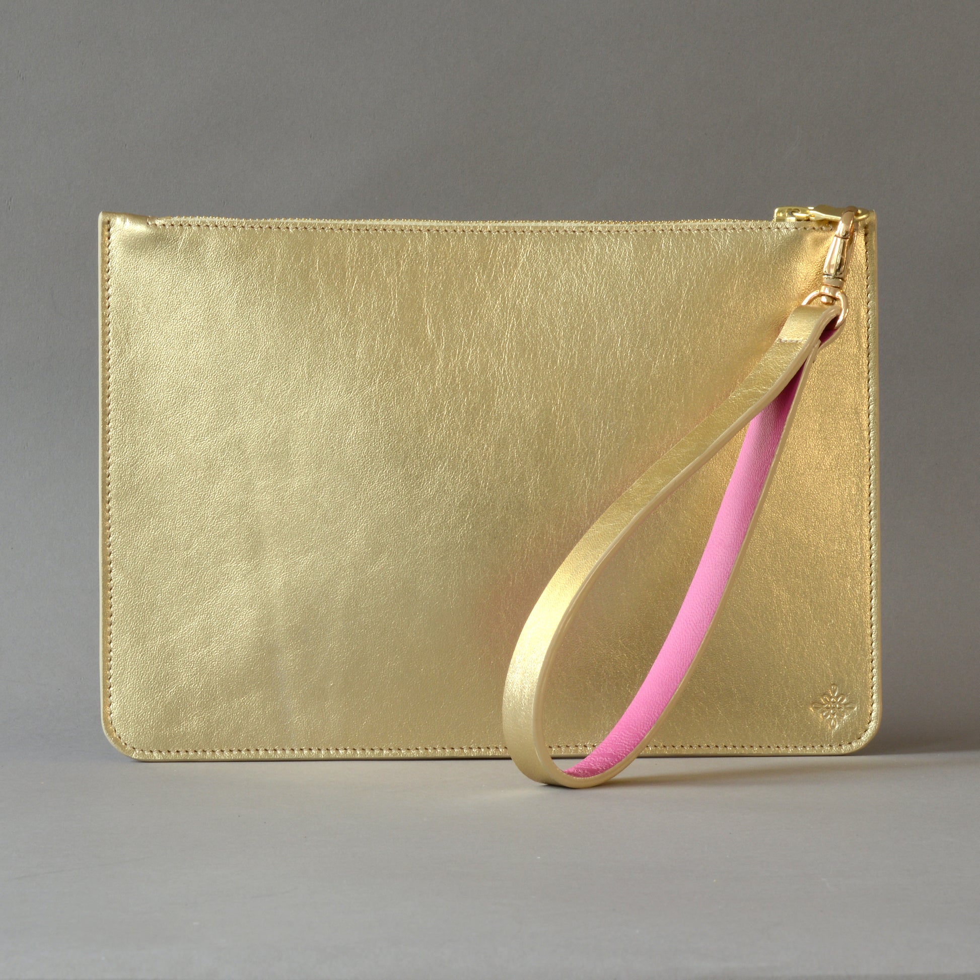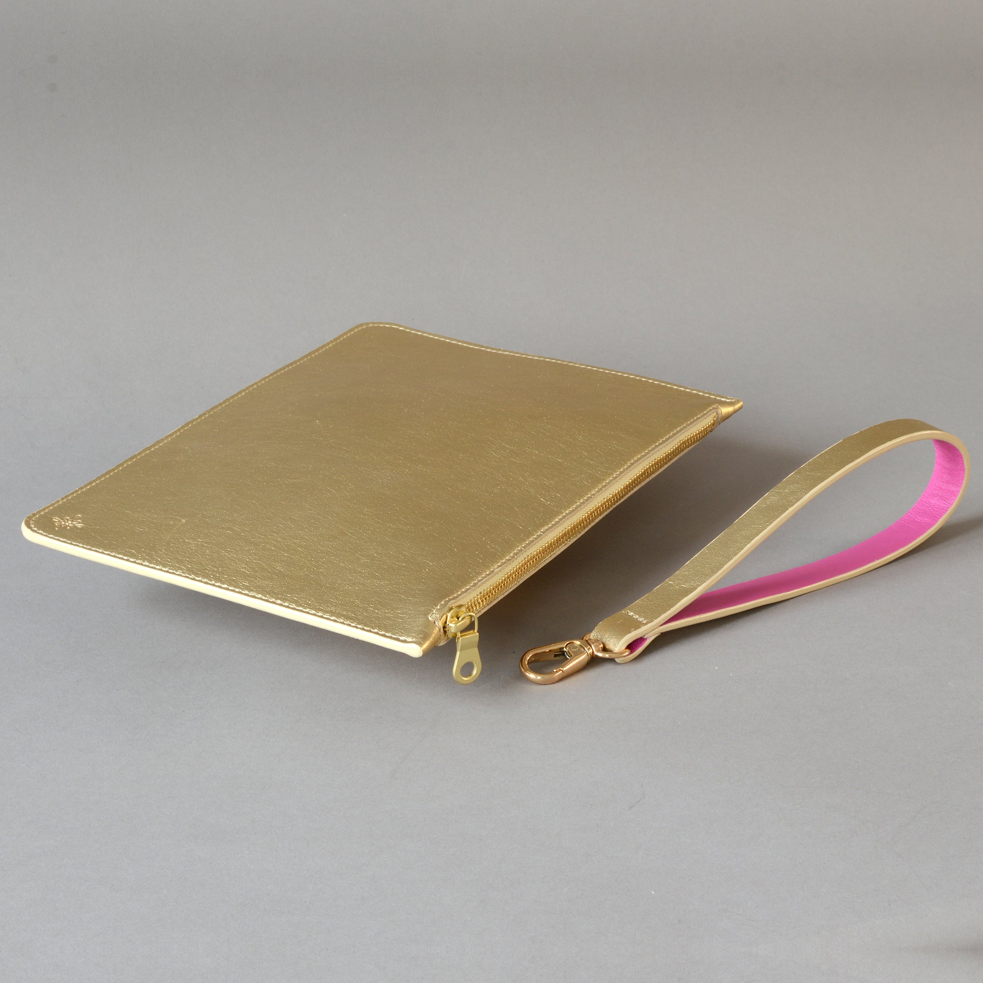 - Detachable gold leather wrist strap lined in pink leather which doubles as the zip puller.