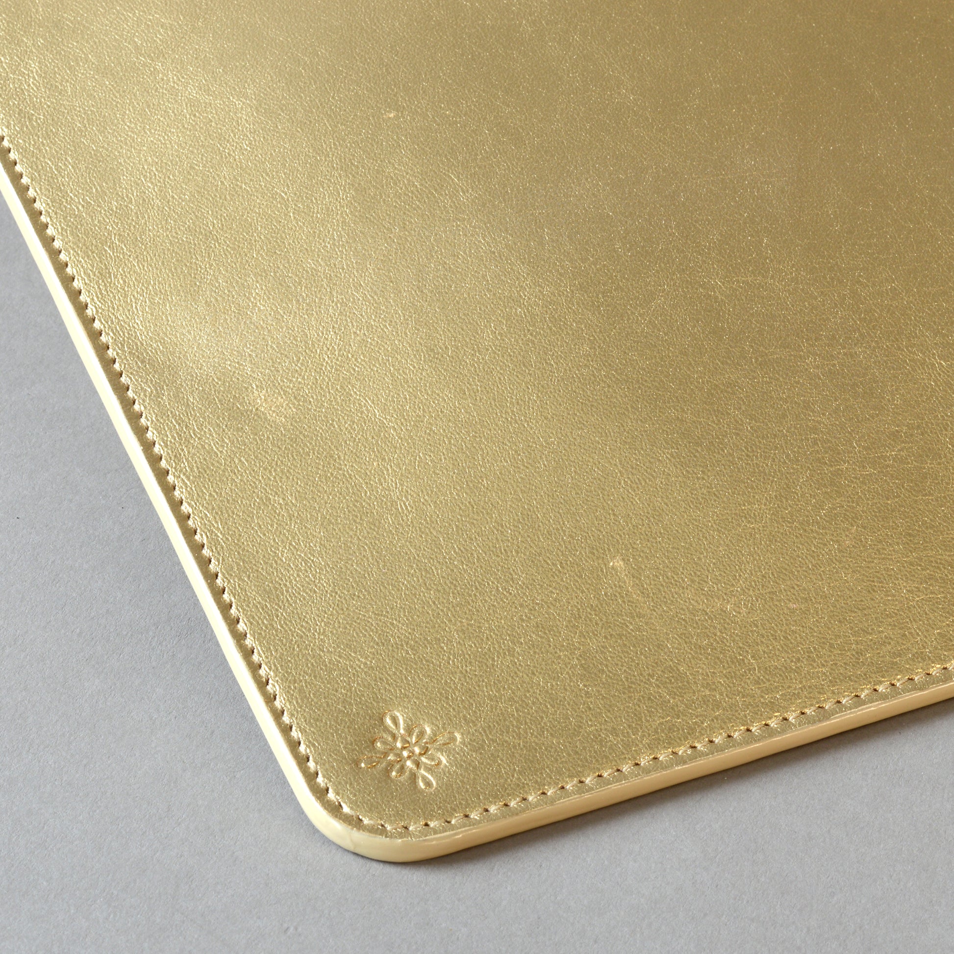 - Features metallic gold Italian leather.